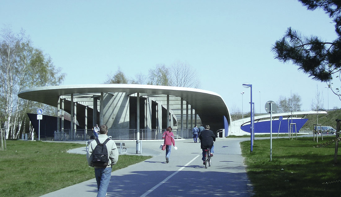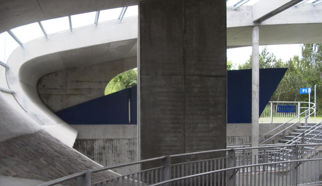 - markant geschwungene Sichtbetonschalen bilden die drei Eingänge – die Dachschale entwickelt sich aus dem Grund, beschreibt eine dynamische Kurve und öffnet sich einladend zum Passanten