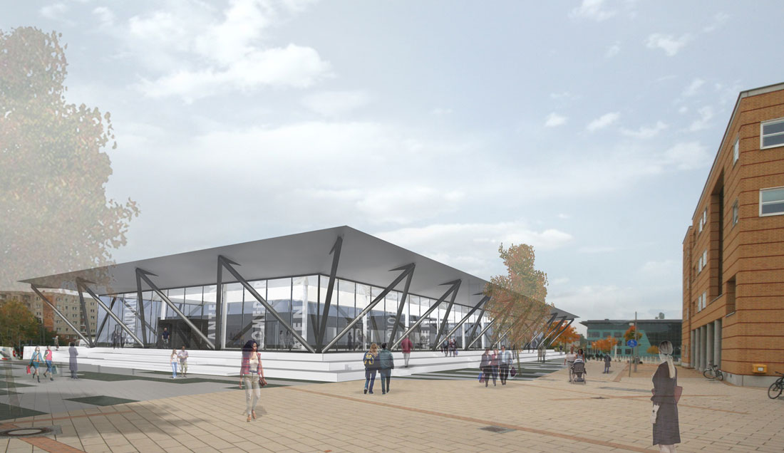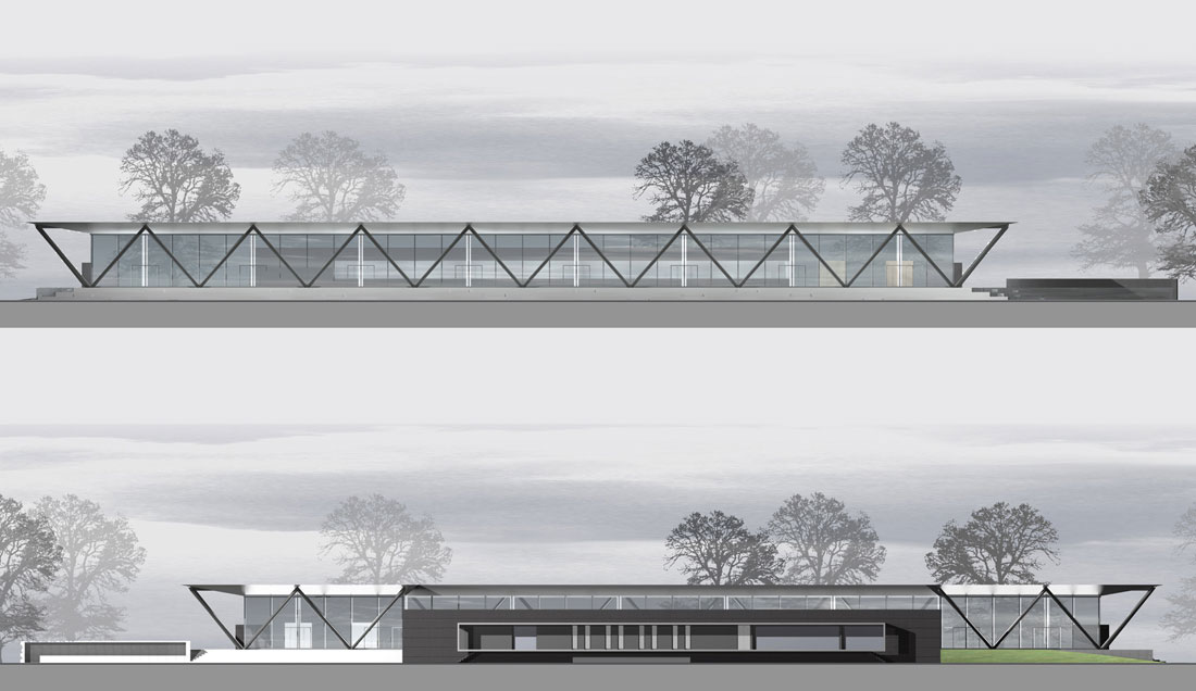 - Unterkellerung nur unter dem zentralen Bereich, hier sind der AWT, Nebenfunktionen, Sanitärbereiche sowie Technikflächen vorgesehen – im Kontrast zum massiven zentralen Block steht die ihn umgebende Halle: getragen durch eine dynamische Stahlkonstruktion spannt sich ein großflächiges und sehr leichtes Dach über das Baufeld