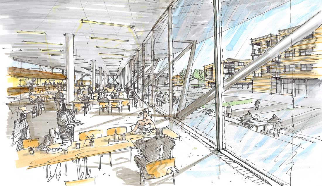 - der Innenraum verfügt über eine klare axiale Ordnung: Zugänge über die Schmalseiten – mittig dazu die Essensausgabe, Theken und Kassenbereiche, über die Längsseite gestreckt der Speisesaal