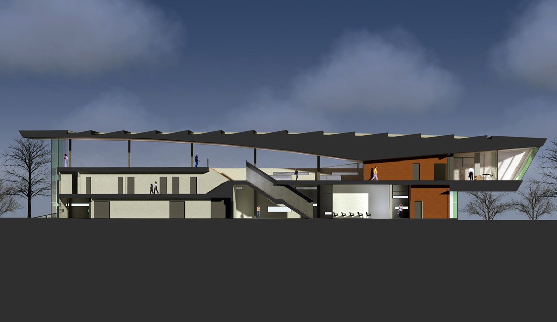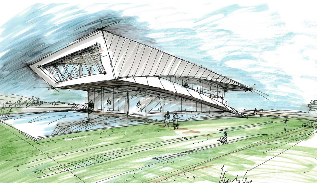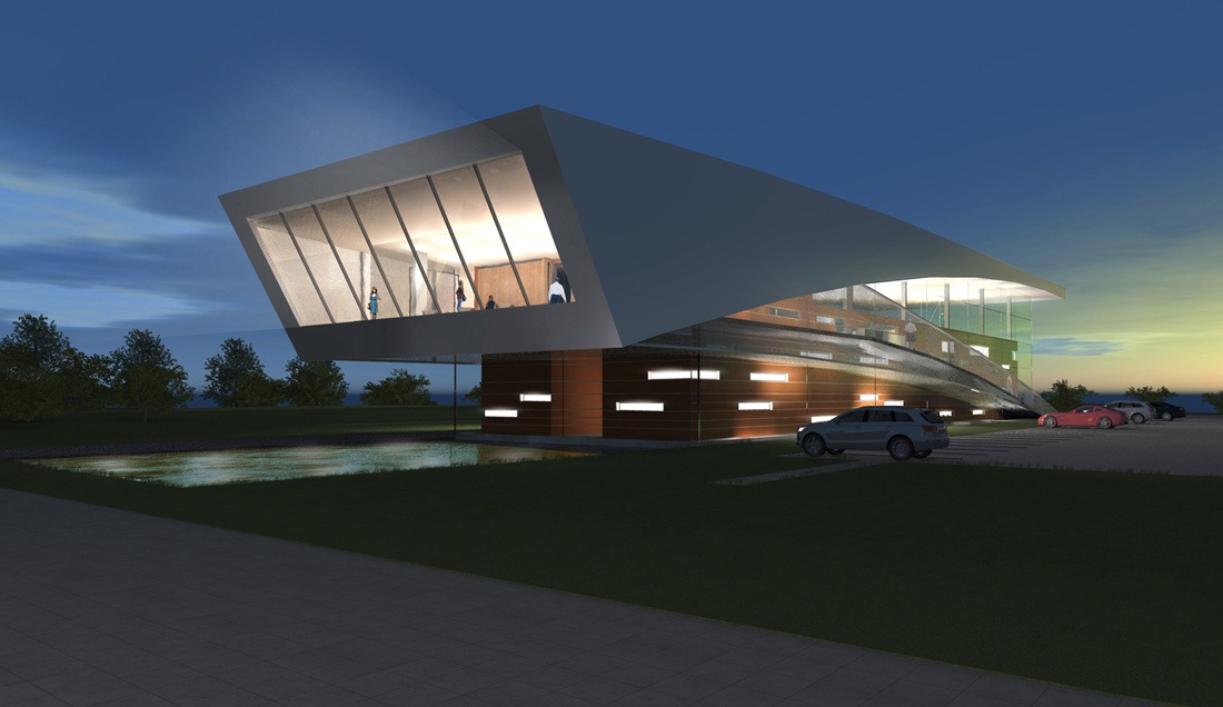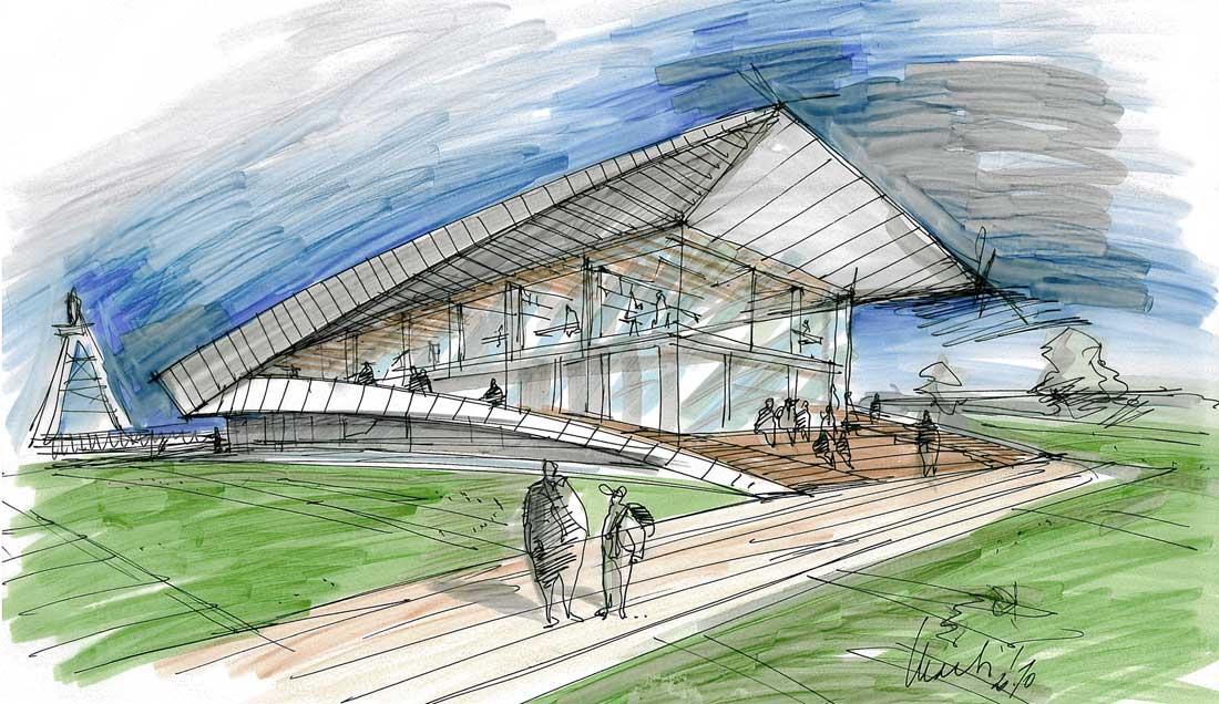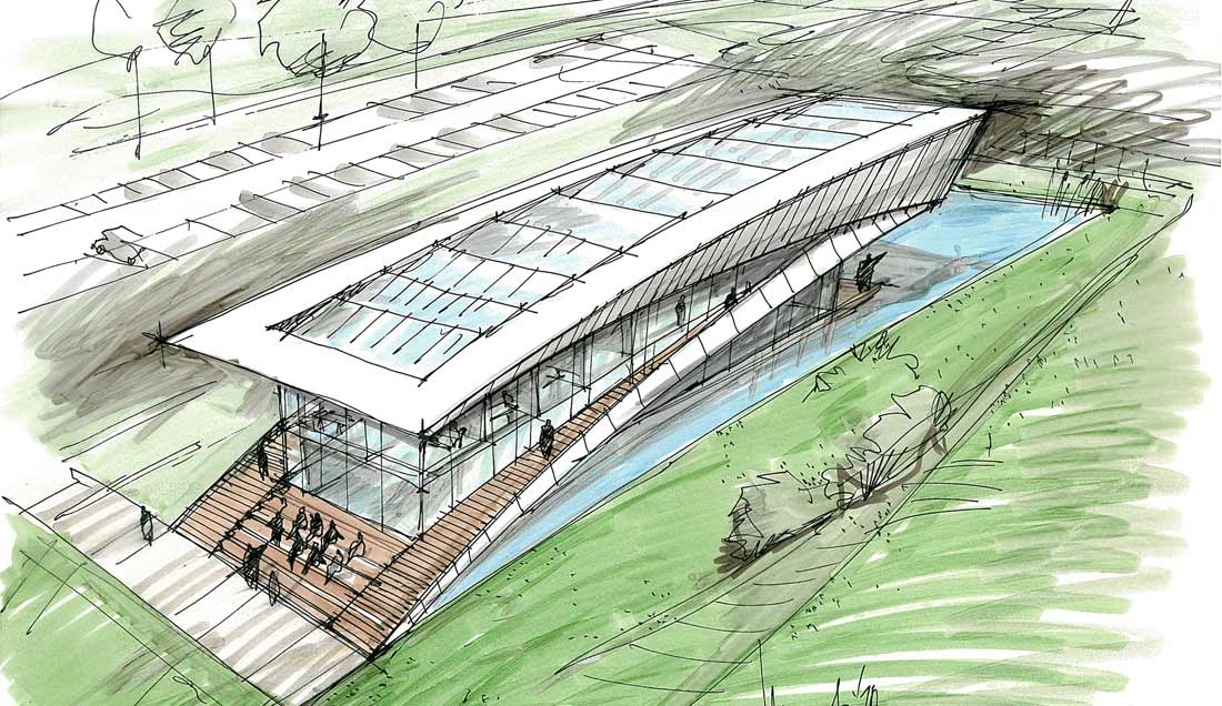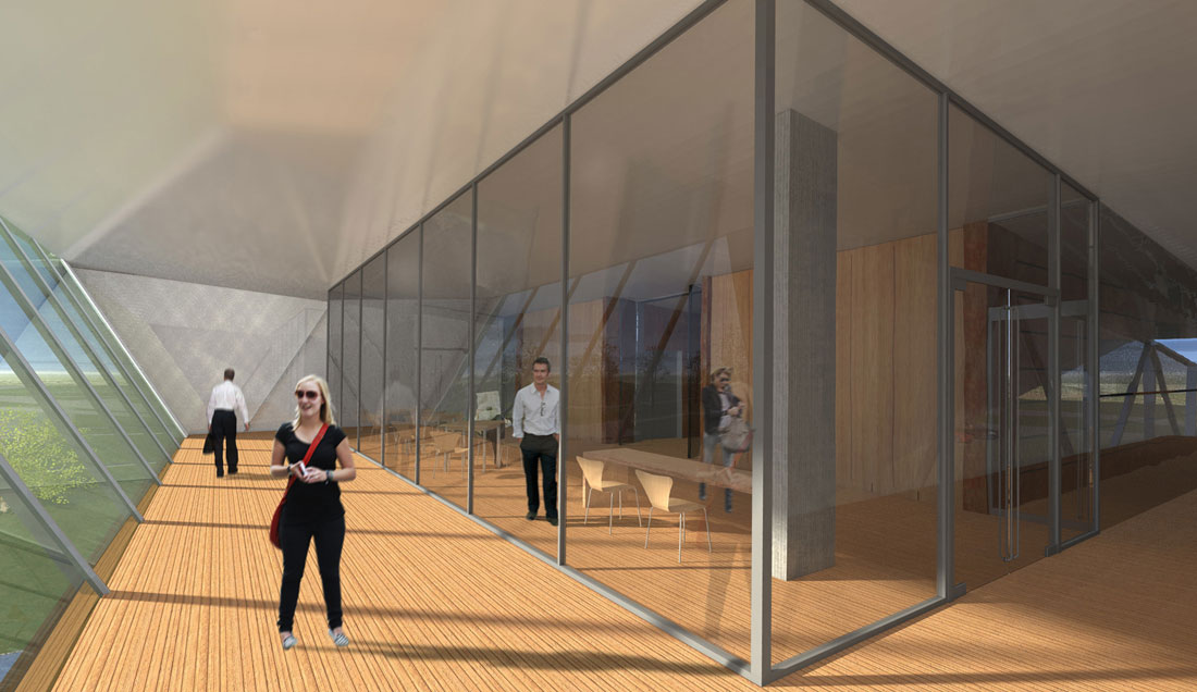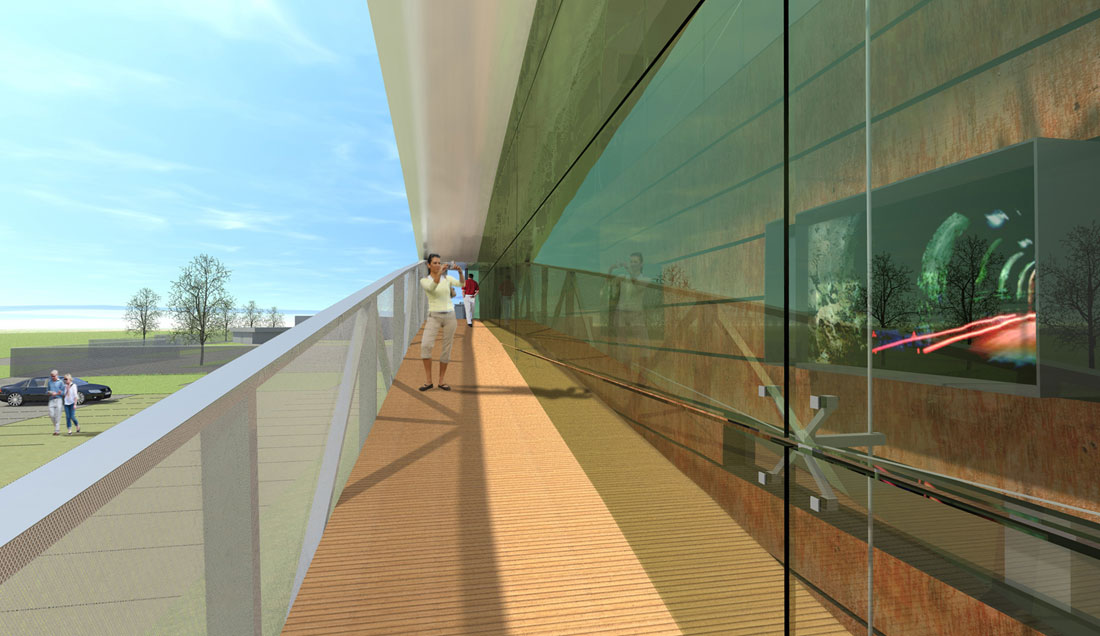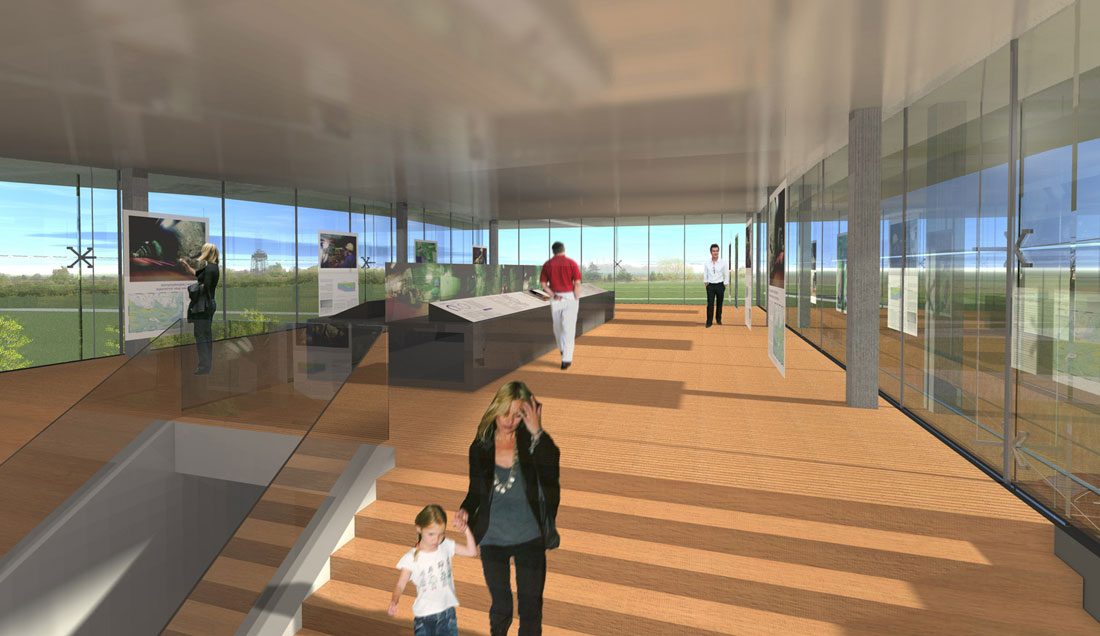 Im Obergeschoss wird der Blick des Besuchers zum Schacht Konrad inszeniert. Ein energetischer Ansatz ist es, Transmissionswärmeverluste durch kompakte Bauform im Passivhausniveau zu begrenzen.
