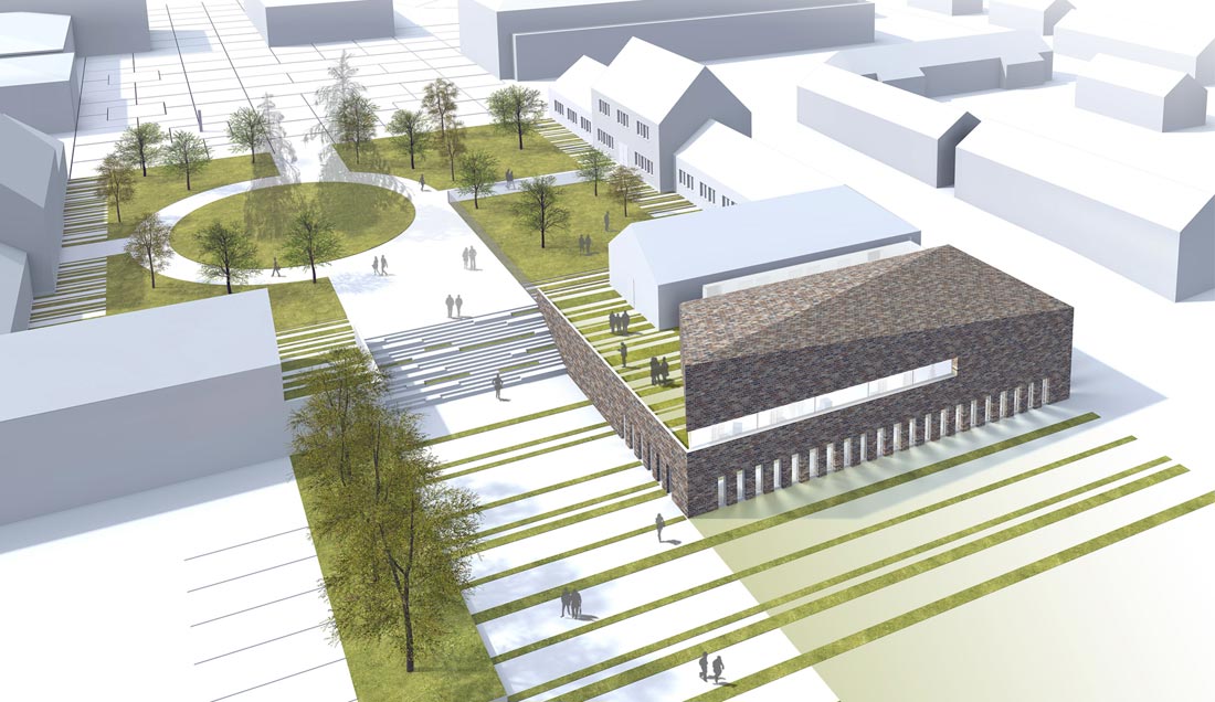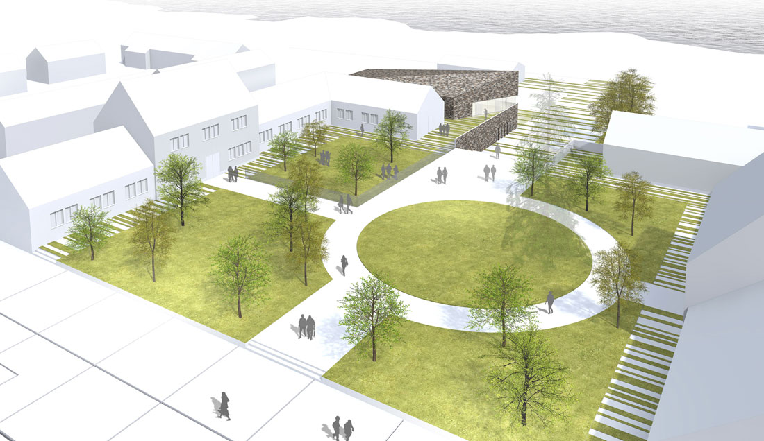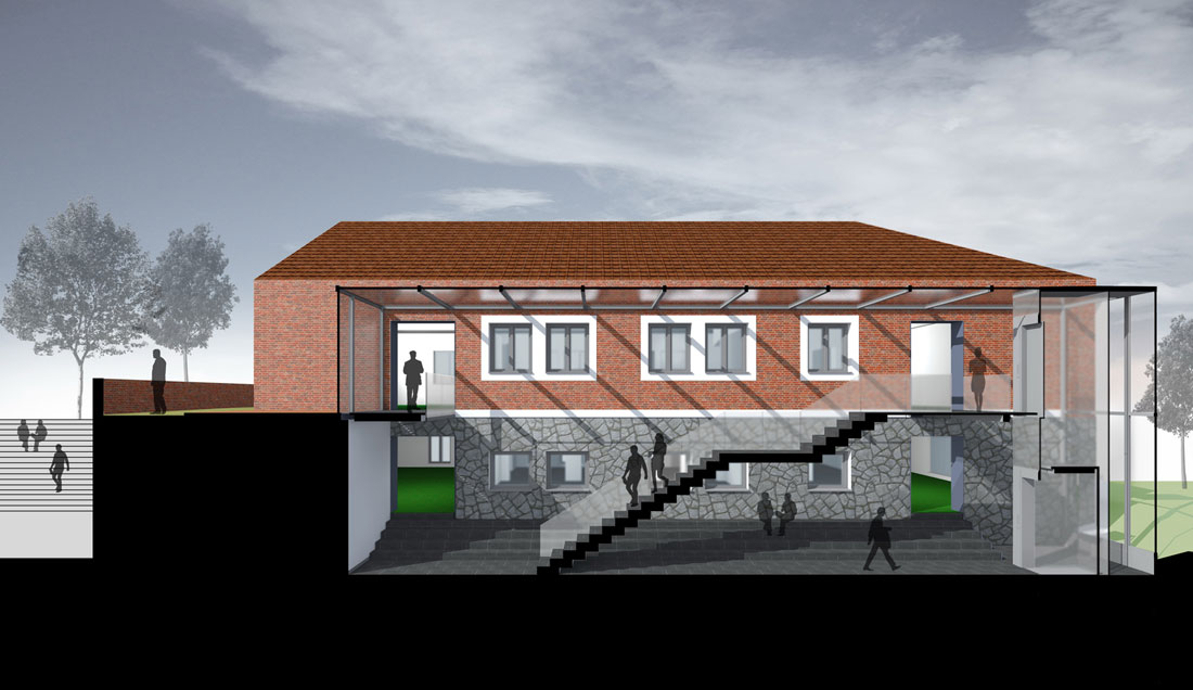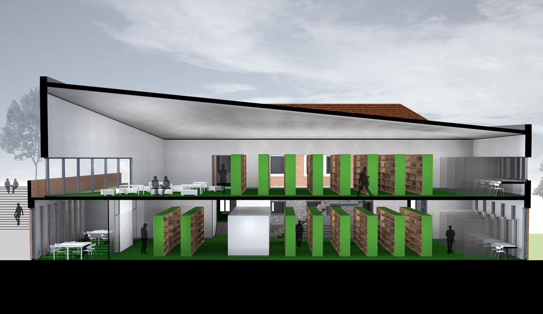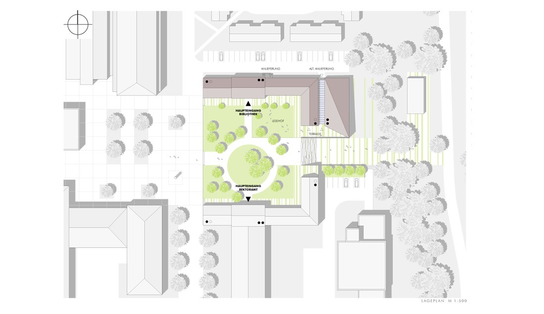 Der Bibliotheksflügel wird im Osten mit einem zweigeschossigen kubisch-kristallinen Baukörper ergänzt. Dieser faltet sich nach Südosten auf – so entsteht eine terrassenartige Erweiterung des Hofes, die Kante des zweiseitig aufsteigenden Daches nimmt dabei die Höhe des Bestandes auf – eine vermittelnde, die Idee des Hofes erweiternde und weiter führende Geste. Es entsteht eine angemessene Präsenz des Neuen durch ein „Weiterdenken“ der inneren Logik des Ortes, des Bestehenden.