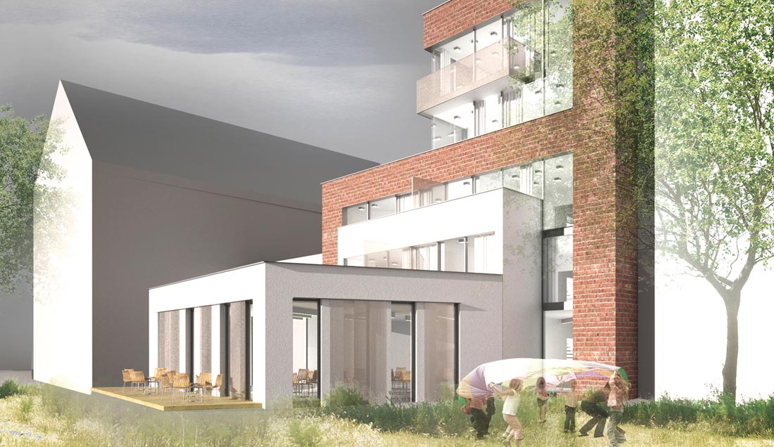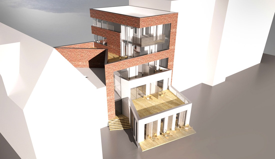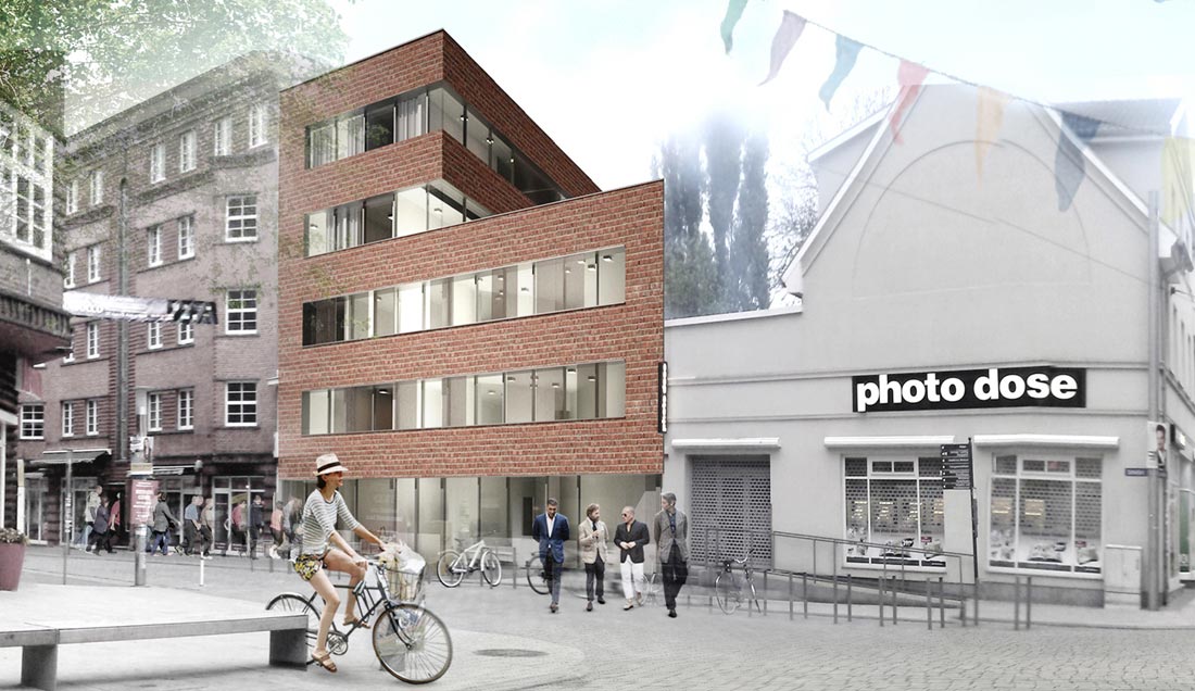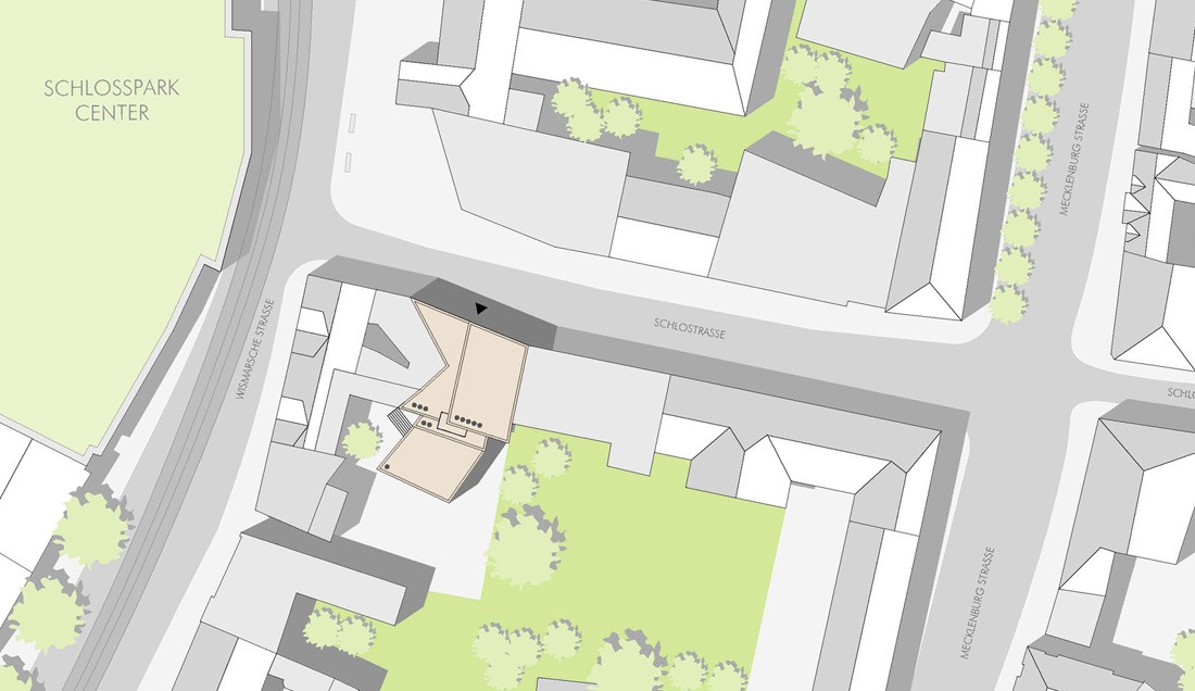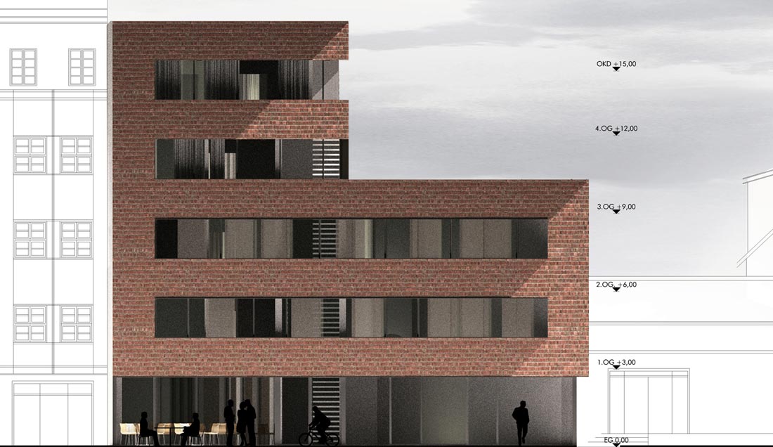 Grundlage des Fassadenentwurfes und der Baukörpergliederung ist das vorgegebene Konzept, diesen galt es in eine dem Ort und der Funktion angemessene, zeitgemäße Form zu kleiden. Die vorgegebenen Grundrisse wurden dabei lediglich im Detail überarbeitet, der Verfasser geht davon aus, dass die vorgegebene Struktur und Zonierung dem gewünschten Bausoll entspricht und nicht zur Disposition stehen. Der Entwurf reagiert mit der Nordfassade (Schlossstraße) auf die Nachbarbebauung, übernimmt die prägende Materialität der Fassade, den Klinker und appliziert diese auf die neue, horizontal gegliederte Form der Bänderung. Im Kontrast zu den deutlich gefassten Obergeschossen schafft das vollverglaste Erdgeschoß ein Maximum an Offenheit und Austausch zwischen Innen und Außen, die Grenze zwischen öffentlichem Straßenraum und Einzelhandelsfläche soll möglichst aufgehoben werden. Über die markante Abtreppung der Fassade von Osten nach Westen vermittelt das Gebäude zwischen den beiden Nachbarfassaden, die hier entstehende großzügige Terrasse im 2.OG steigert die Wohnqualität deutlich und gliedert das Straßenbild interessant. Die Hoffassade ist auf Grund der vielfältigen einschränkungen der Bebaubarkeit durch abstandsflächen stark gegliedert. Der vorliegende entwurf fasst diese starke Differenzierung über eine klare Gliederung der Baumassen und der drei kontrastierenden Materialien Klinker, Putz und Glas zu einem logisch strukturierten Gebäude zusammen. Die Prinzipien der baukörperlichen Durchdringung, der abstandgebenden Fuge sowie der funktionsgeprägten Gestalt geben dem Bau Ordnung und Haltung.