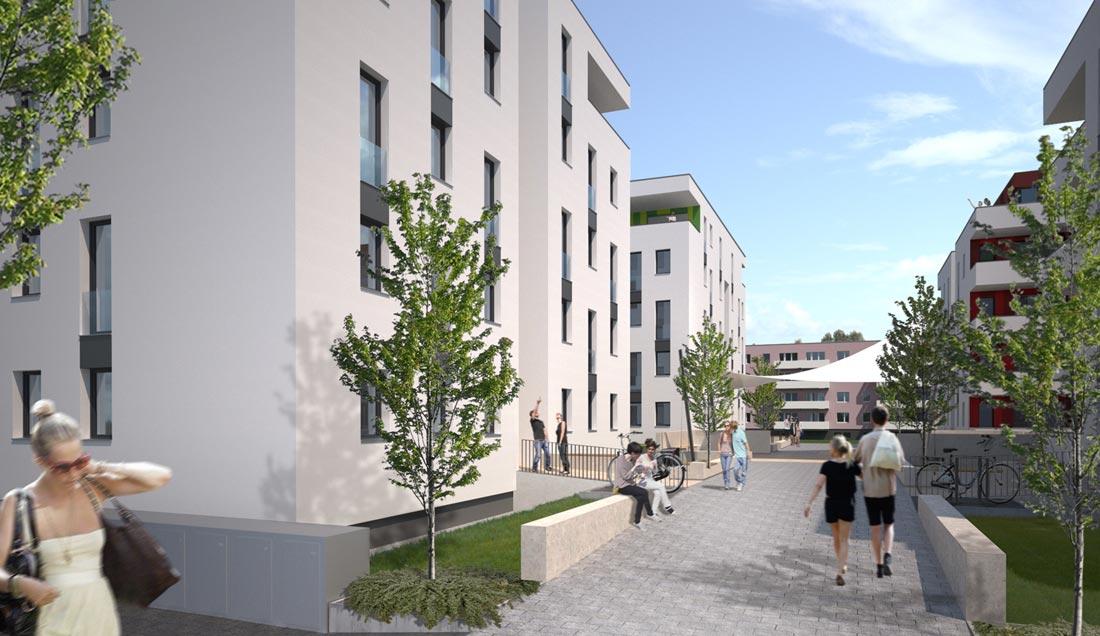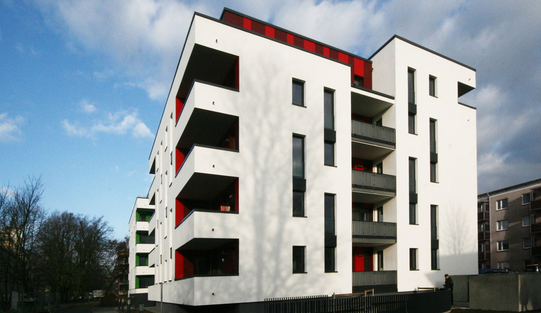 Die Majakowskistraße ist Teil einer Stadterweiterung aus den 1960er Jahren, hier sind zwei industriell errichtete Wohngebäude abzubrechen und durch Neubauten zu ersetzen. Ziel der Baumaßnahme ist es hochwertigen Wohnraum sowohl für die Bestandsmieter der Wohnungsgenossenschaft als auch für junge Familien im Sinne eines Neuzuzuges in diesen Stadtteil zu schaffen. Dementsprechend finden sich in den 3 Baukörpern deutlich differenzierte Grundrisslösungen, welche sich jeweils aus den gleichen Grundelementen speisen, um einer wirtschaftlichen Bauweise gerecht zu werden. Jeder Wohnung ist ein eigener barrierefreier Loggien- oder Terrassenbereich, sowie ein Tiefgaragenstellplatz mit zugehöriger Abstellfläche zugewiesen. Sämtliche Hauptwohnräume sind optimal zur Sonne orientiert, Küchen und Bäder sind im wesentlichen außen liegend. Neben den hohen Standards der Wohungen im inneren wurde besonderer Wert auf eine auch im Außenraum der Wohnanlage erkennbar neue Qualität gelegt. So formuliert die Wohnanlage Majakowskistraße über den gemeinschaftlichen inneren Hof und die zugehörigen Aufenthalts- und Kommunikationsbereiche eine eigene Adresse in dem sonst durch seriellen Zeilenbau geprägten Bezirk.