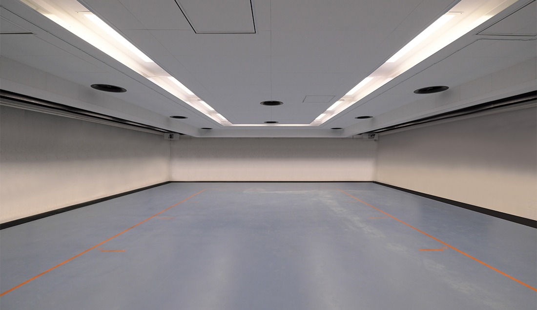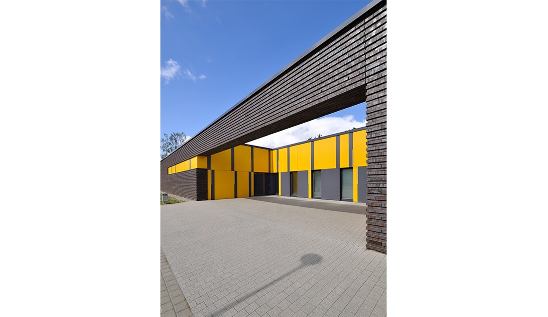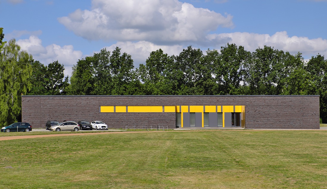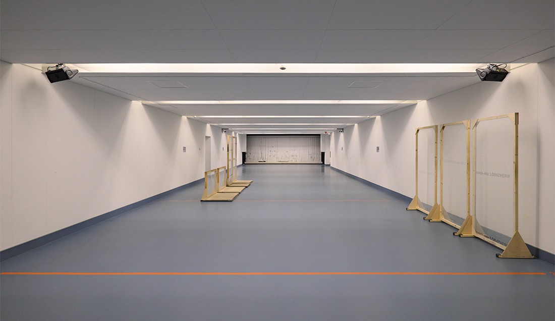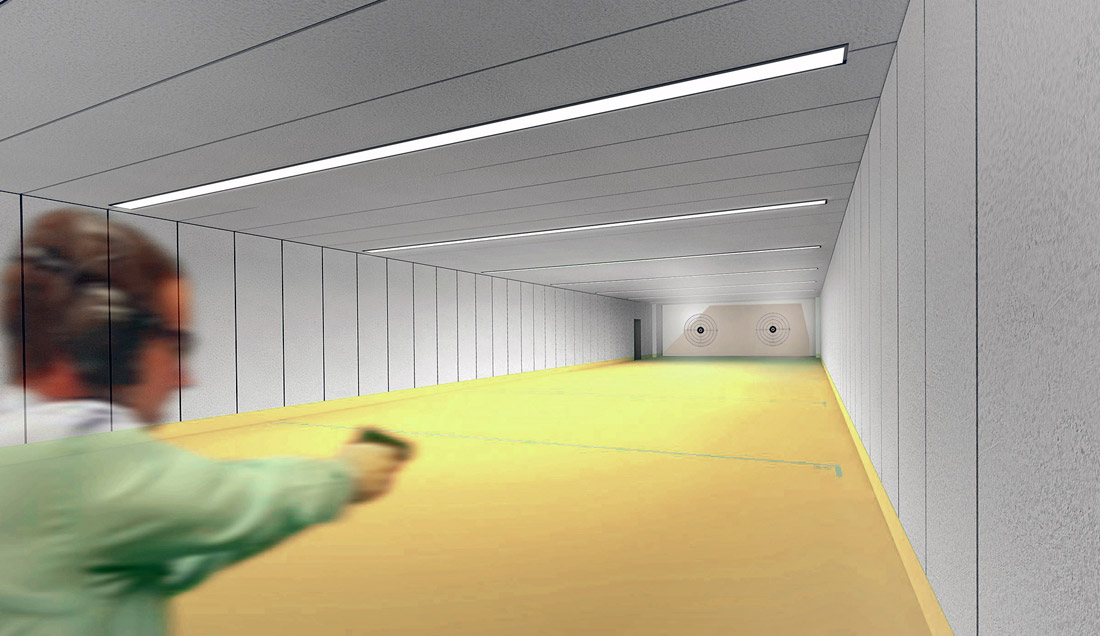 Der Neubau des Trainingszentrums in Güstrow besteht aus zwei Raumschießanlagen: einer 25m-Anlage und einer 180°-Anlage, ergänzt um Schul- und Trainingsflächen. Ausgehend von der konsequenten Umsetzung aller technischen und logistischen Anforderungen von Raumschießanlagen resultiert ein klar strukturierter Grundriss auf einer Ebene. Die äußere Gestalt präsentiert sich – der inneren Funktion entsprechend – sehr introvertiert über einen gestreckten kubischen Baukörper gefasst. Konsequente Einschnitte in die Backsteinfassade lassen den Kern in Form der deutlich kontrastierenden inneren Materialität erlebbar werden. Der Baukörper ordnet sich in Höhe und Proportion dem umliegenden denkmalgeschützten Bestand unter. Durch die raumökonomische Anordnung der Technikbereiche kann auf ein zusätzliches Lüftungsgeschoss verzichtet werden. Die Raumschießanlagen entsprechen den neuesten Standards und simulieren über eine 180° Projektion mit automatisierter Treffererkennung sowie flexible Raumszenarien ein wirklichkeitsnahes Übungsumfeld.