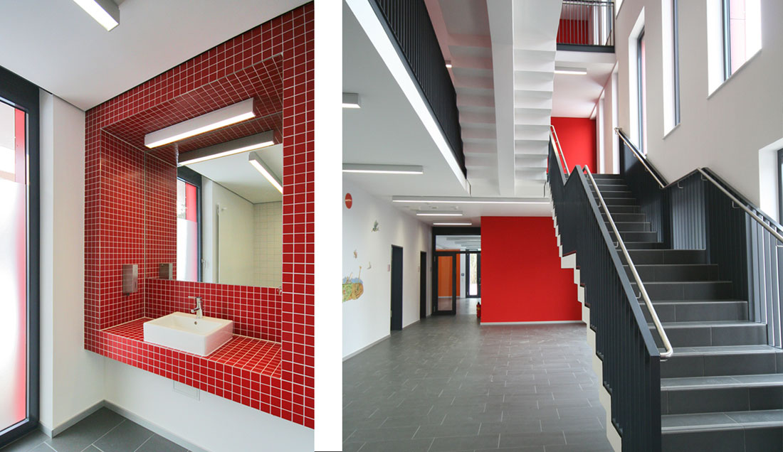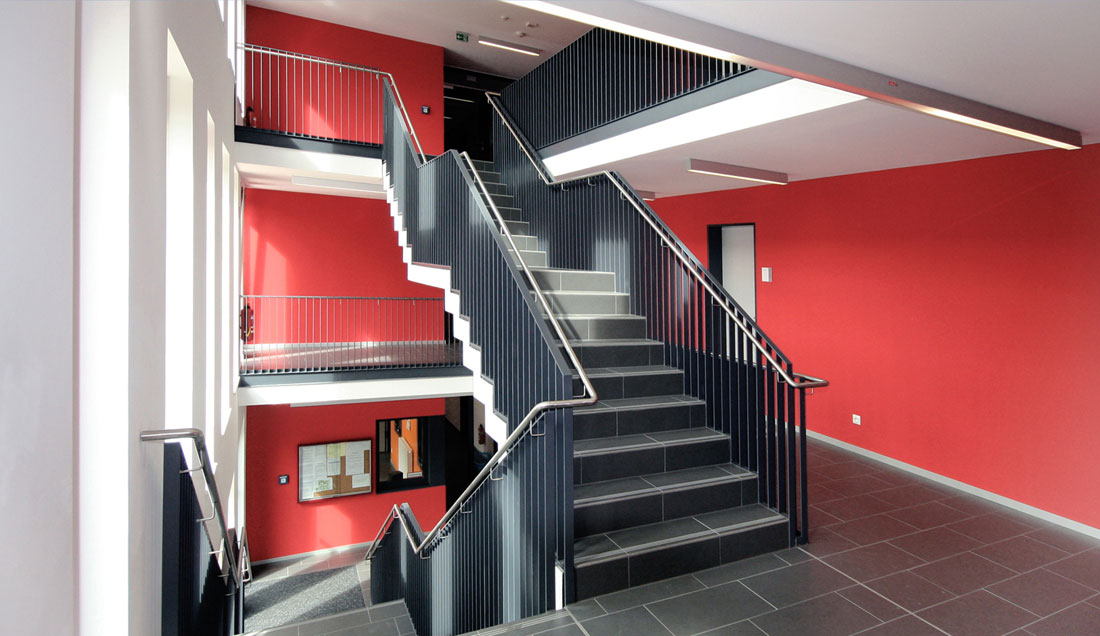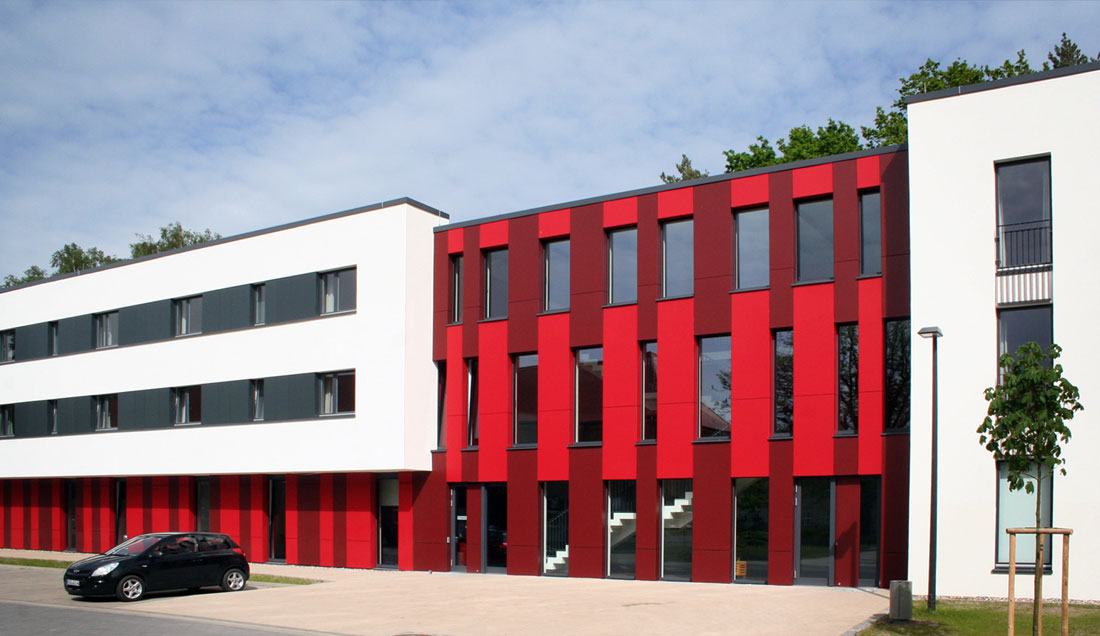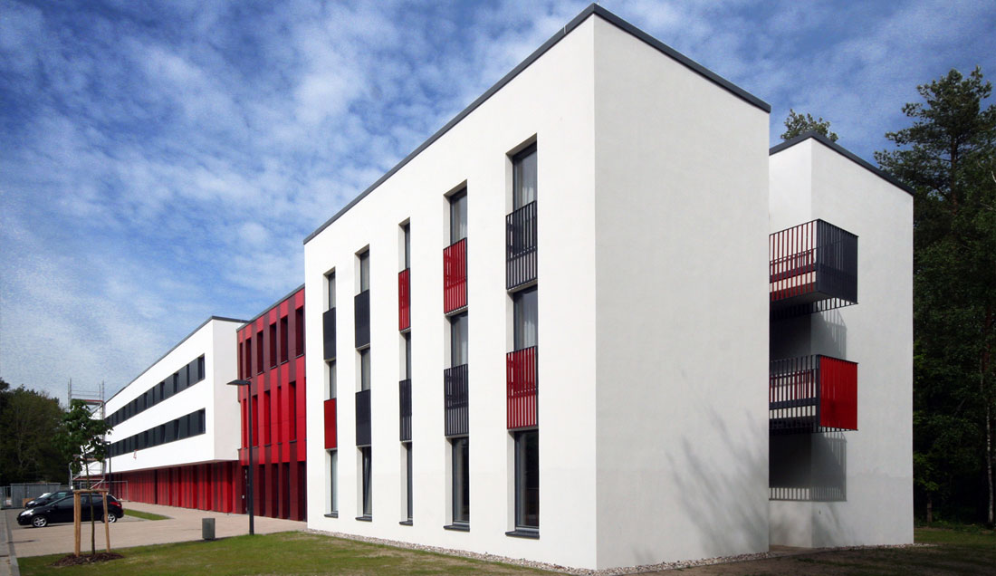 Die Fachschule für Agrarwirtschaft war in einem Ihrer letzten Bauabschnitte um ein Wohnheim als Ersatzneubau zu ergänzen. Die zu realisierenden Funktionen umfaßten neben den 135 Wohnheimplätzen in 2-Bett-Zimmern Gemeinschaftsflächen für schulpräventive Maßnahmen sowie einen Verwaltungsbereich. Das 2011 fertig gestellte Wohnheim ergänzt die Bestandsbauten aus den 50er und 60 er Jahren im Sinne eines Gesamtensembles. Es differenziert sich zu diesen aber auch als klar zeitgemäßer Baukörper, welcher seiner baukörperliche Proportionierung aus den inneren Funktionalitäten heraus entwickelt. Wenige markant gesetzte Materialitäten, Farbigkeiten und Fassademotive führen zu einer selbstbewussten und zugleich maßstäblich angemessenen Haltung. Die Erschließungsbereiche sind dabei im Inneren bewusst großzügig als multifunktionale Aufenthalts- und Kommunikationszonen ausgebildet. Die effektive und wirtschaftliche Gesamtkonzeption führte zu einer deutlichen Unterschreitung der vorgesehenen Baukosten.