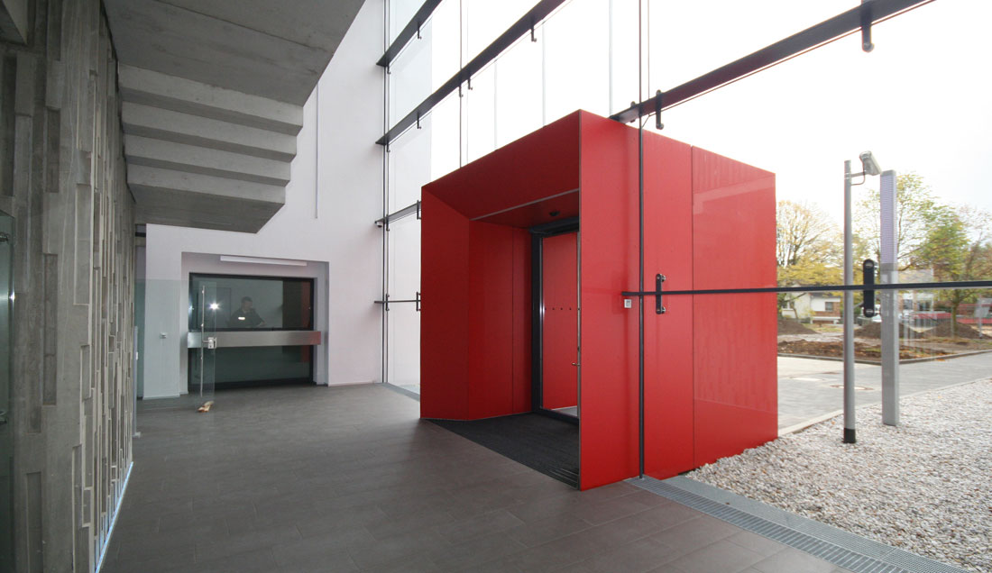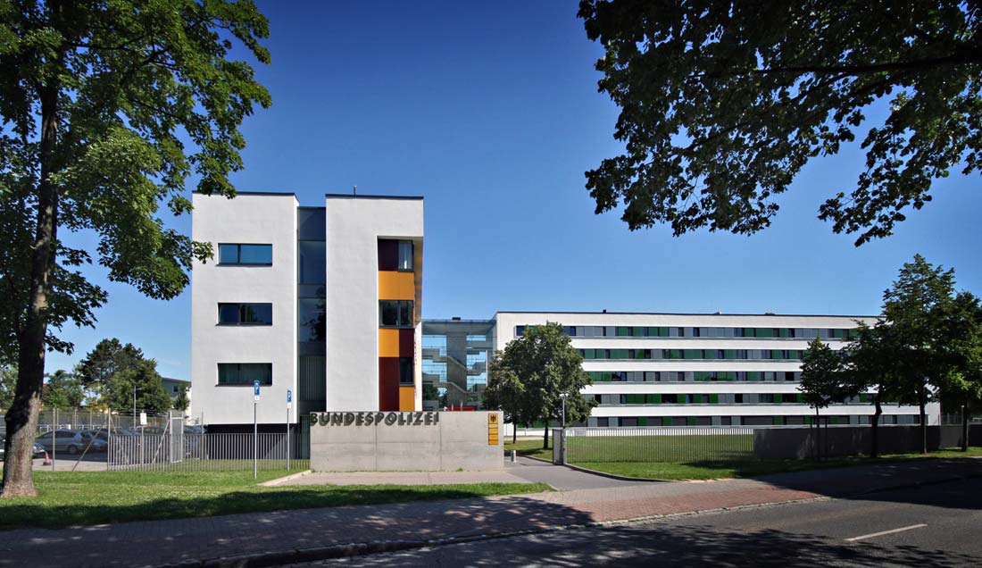 Das Bundespolizeiamt Mecklenburg-Vorpommern mit Führungs-, Verwaltungs- und Einsatzbereichen, sowie den entsprechenden Servicefunktionen war an einem neuen Standort angemessen unterzubringen. Neben der Sanierung und dem Umbau eines Bestandsgebäudes für Büronutzungen wurde ergänzend ein Neubau, der die Funktionsbereiche Einsatzleitung, Schulung, Unterkunft und Büro abdeckt, errichtet. Die bauliche Ergänzung erfolgte durch einen klar strukturierten, massiven Zweibund rechtwinklig zum Bestandsgebäude, wobei die Erschließung beider Baukörper über einen zentralen gläsernen Verbinder erfolgt. Durchlaufende Bänderungen im Altbau und plastisch gefasste Mosaikfüllungen im Neubau erzielen die gestalterische Bindung bei gleichzeitiger Differenzierung beider Gebäudeteile.